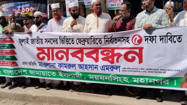আজ ১৪ আগস্ট মঙ্গলবার সকাল ১১ টা থেকে ১টা পর্যন্ত মানববন্ধন করেন ময়মনসিংহ মহানগরী জামায়াত। বাংলাদেশ জামায়াতে ইসলামীর কেন্দ্রীয় কর্ম সূচির অংশ হিসাবে আজ পালিত হয় উক্ত মানববন্ধন।